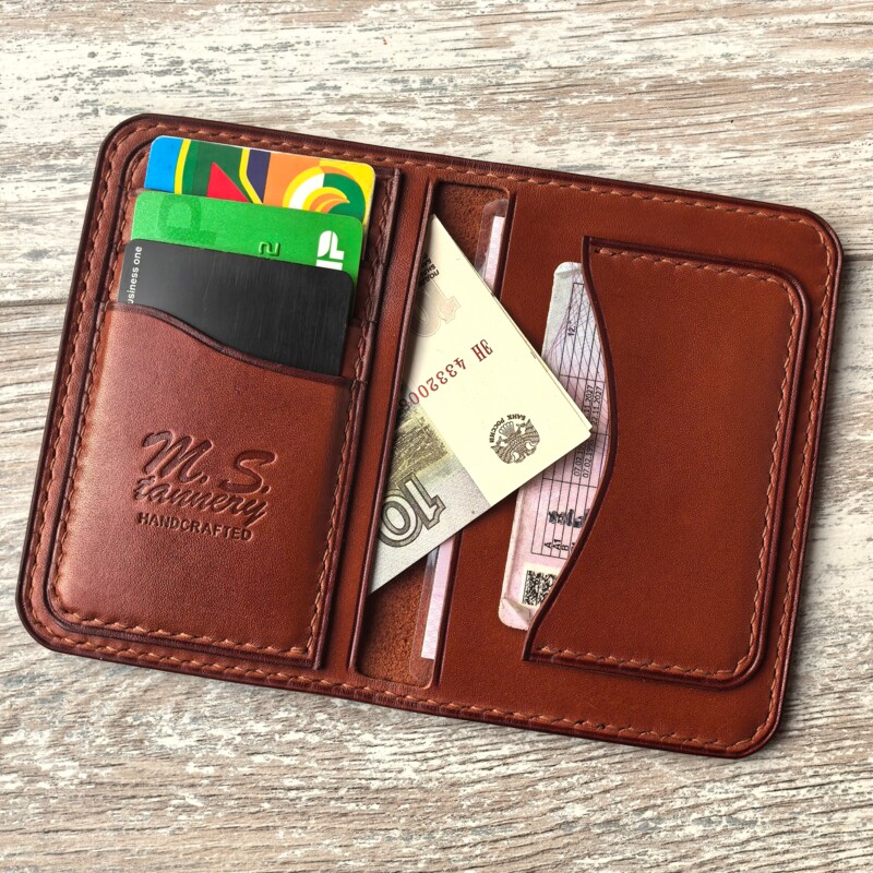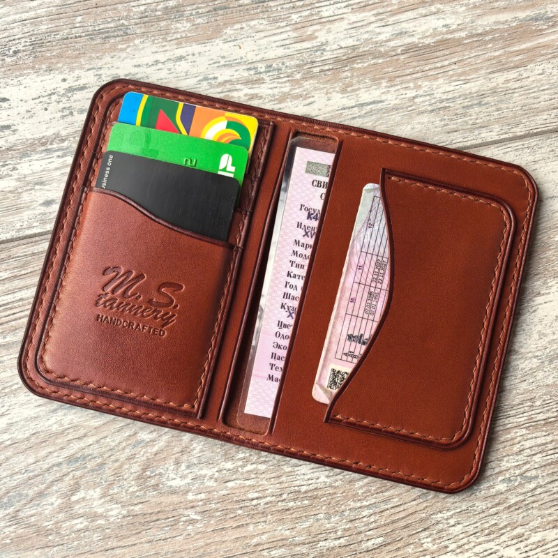 Наполняемость: два отдела под СТС и наличные, сложенные пополам, карман для водительского удостоверения и три кармана для карт.